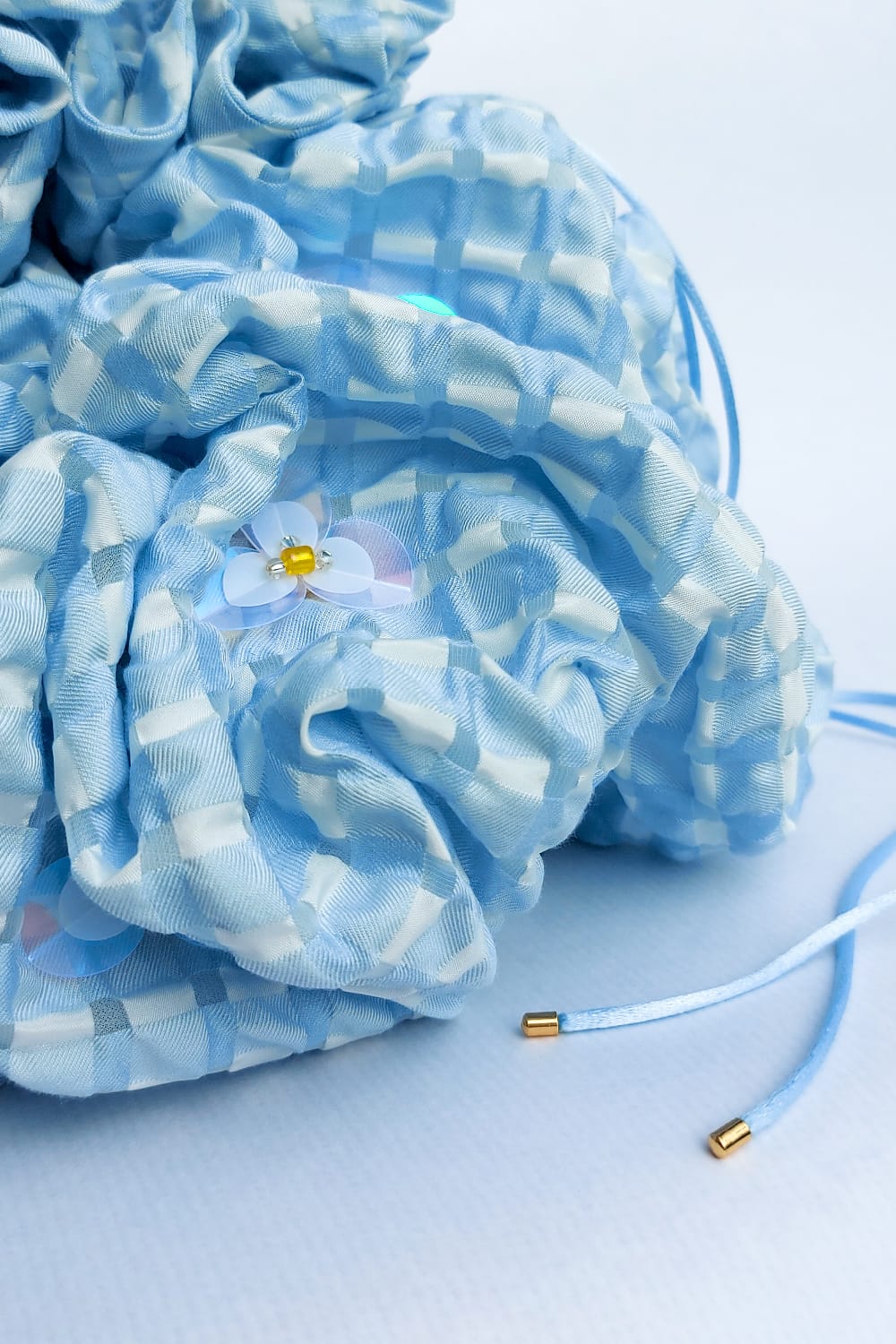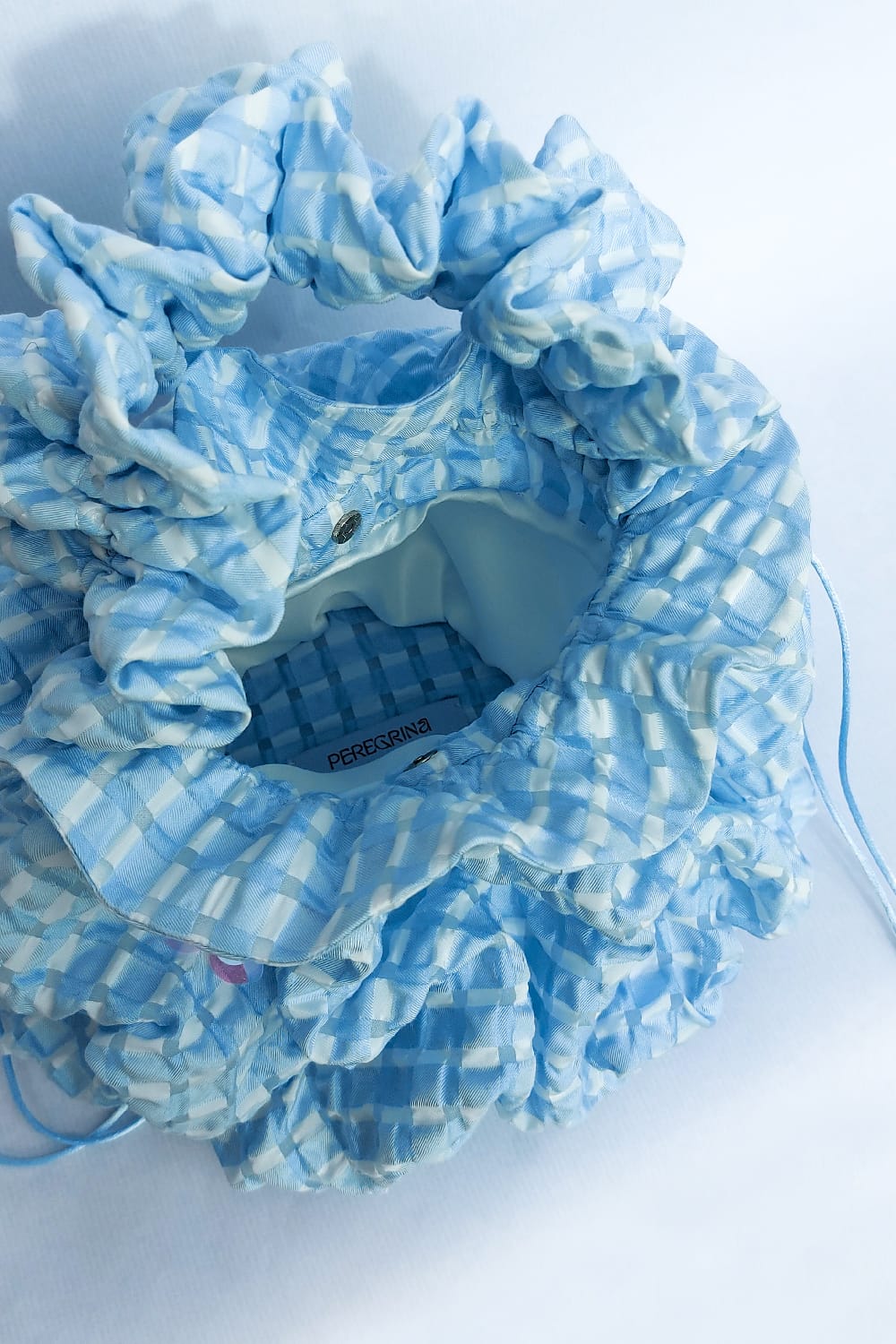 La nube azul de Peregrina, se inspira en los cielos abiertos, salpicados de nubes y destellos del sol. Una suave y aireada nube en jacquard cloqué azul cielo, decorada con delicadas e iridiscentes flores en tonos blanco y amarillo.