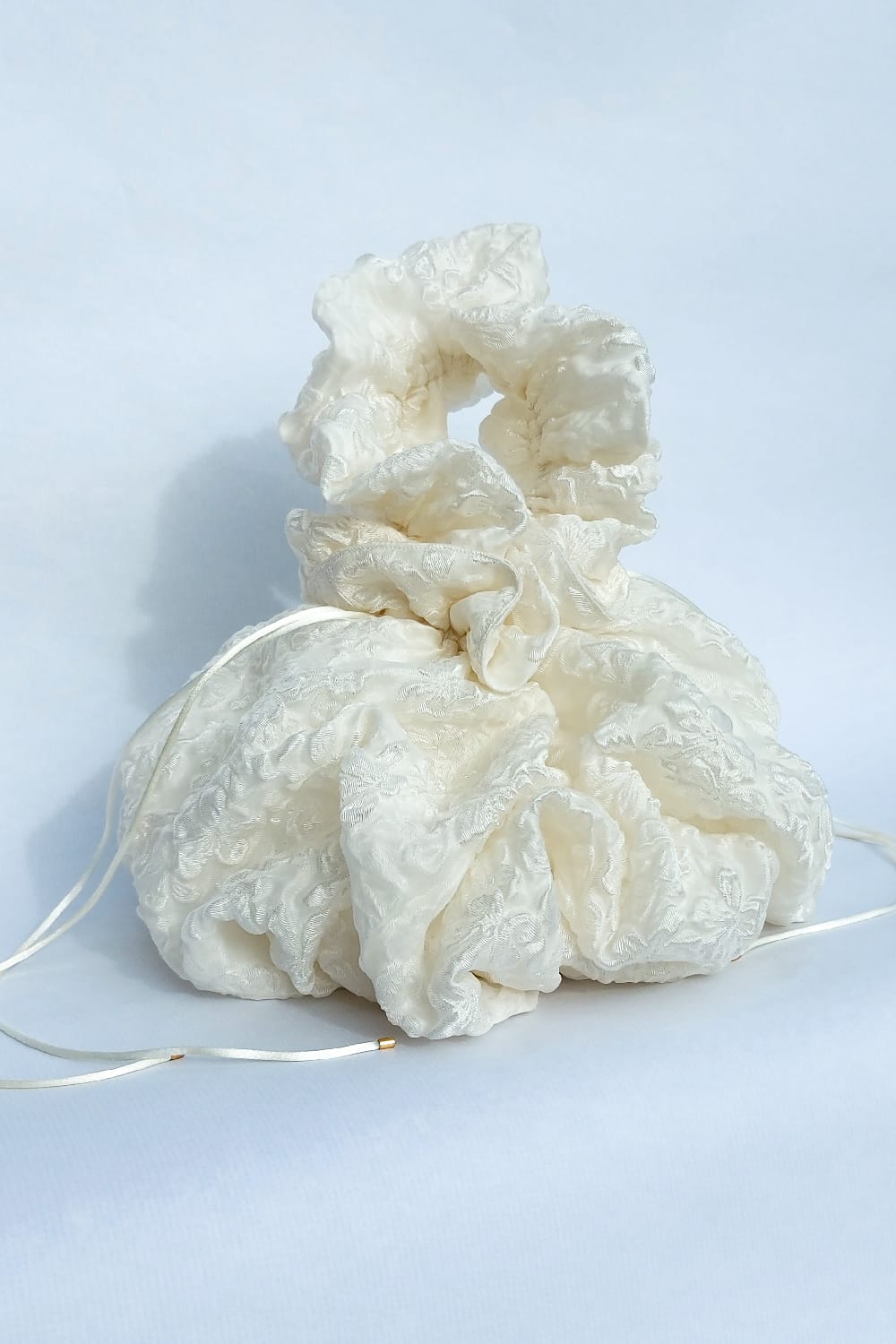 La nube blanca de Peregrina, se inspira en la calma de los cubiertos cielos nublados. Una suave y aireada nube en jacquard cloqué blanco puro, decorada con delicadas e iridiscentes flores en tonos verdes.