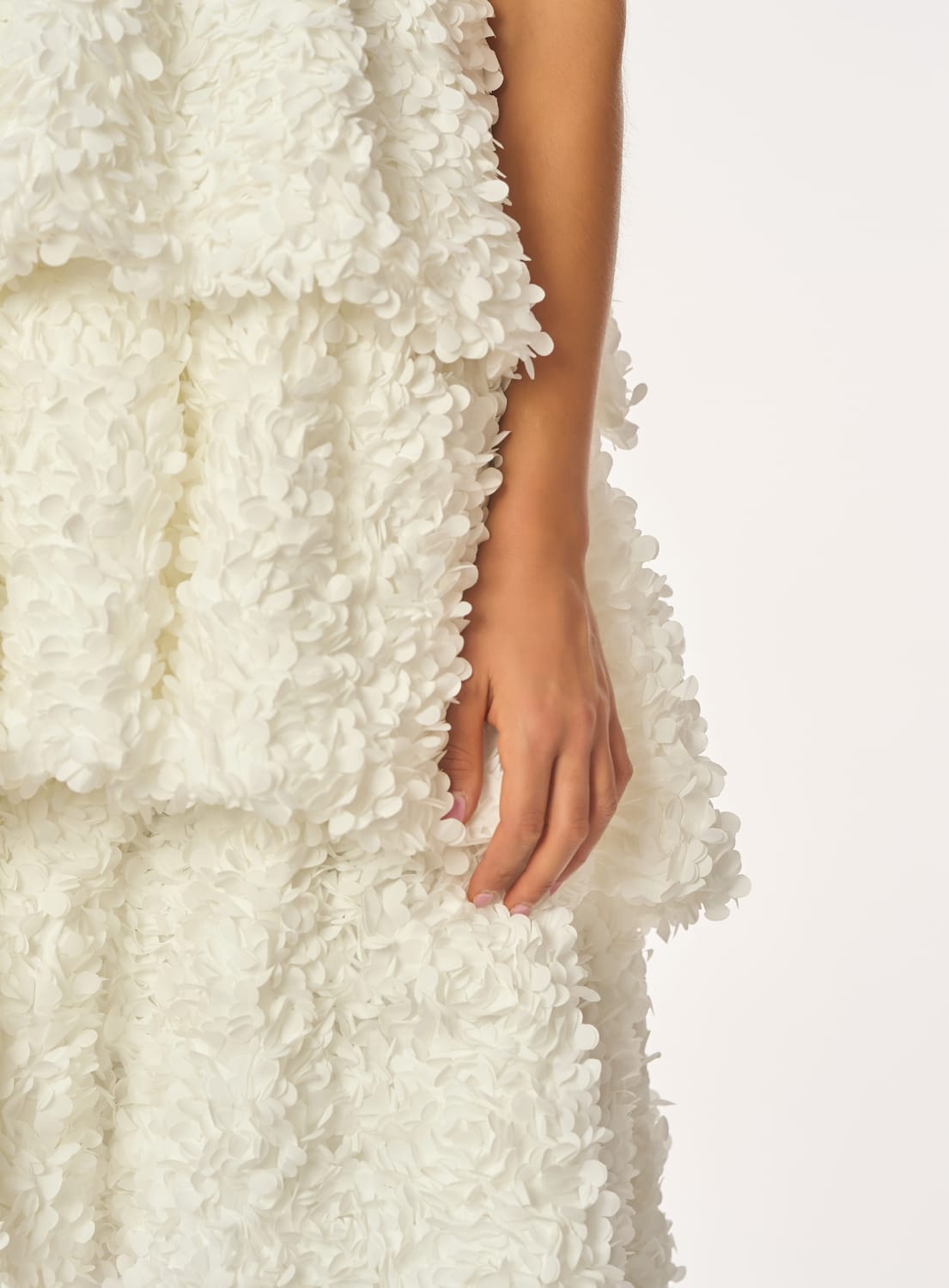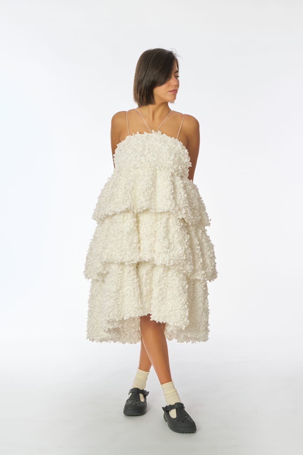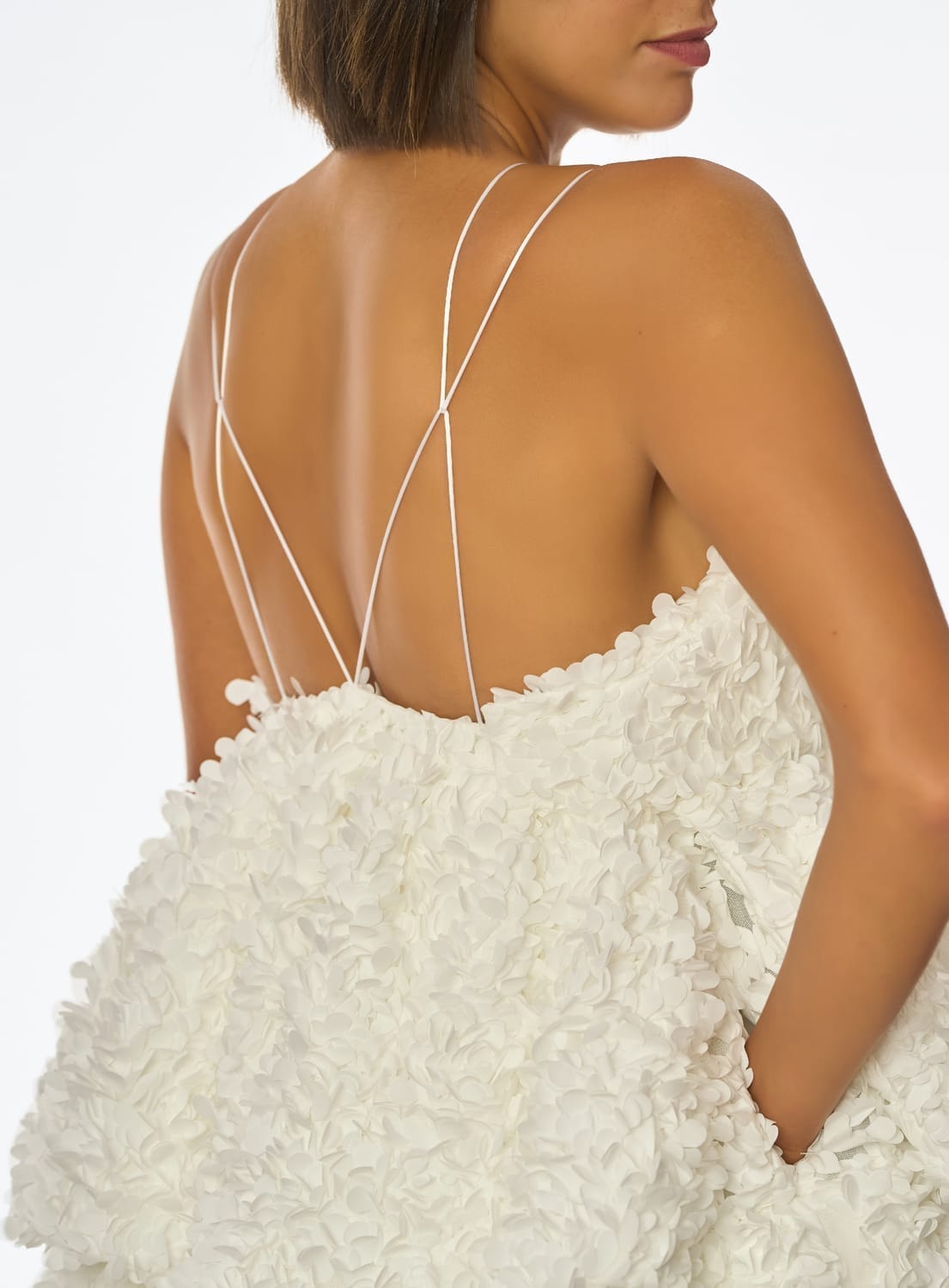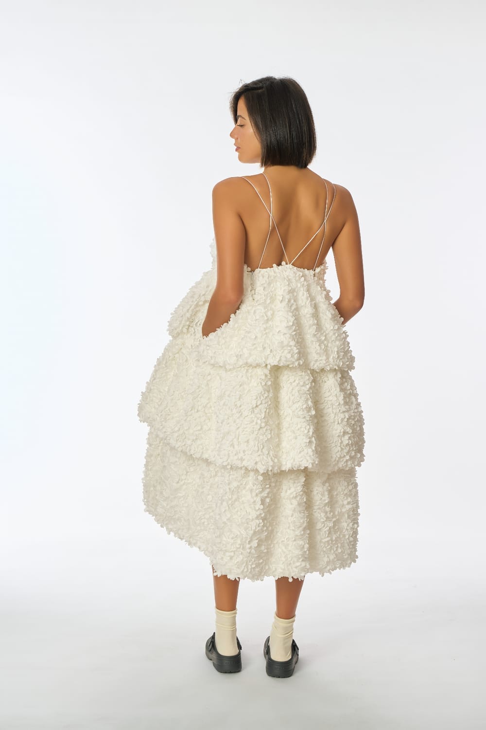 Exuberante y cautivador vestido midi confeccionado en tul bordado con pétalos en relieve. Una suave e imponente nube blanco roto formada por la superposición de amplios volantes, contrastada con su delicada espalda escotada con finos y sutiles tirantes cruzados.