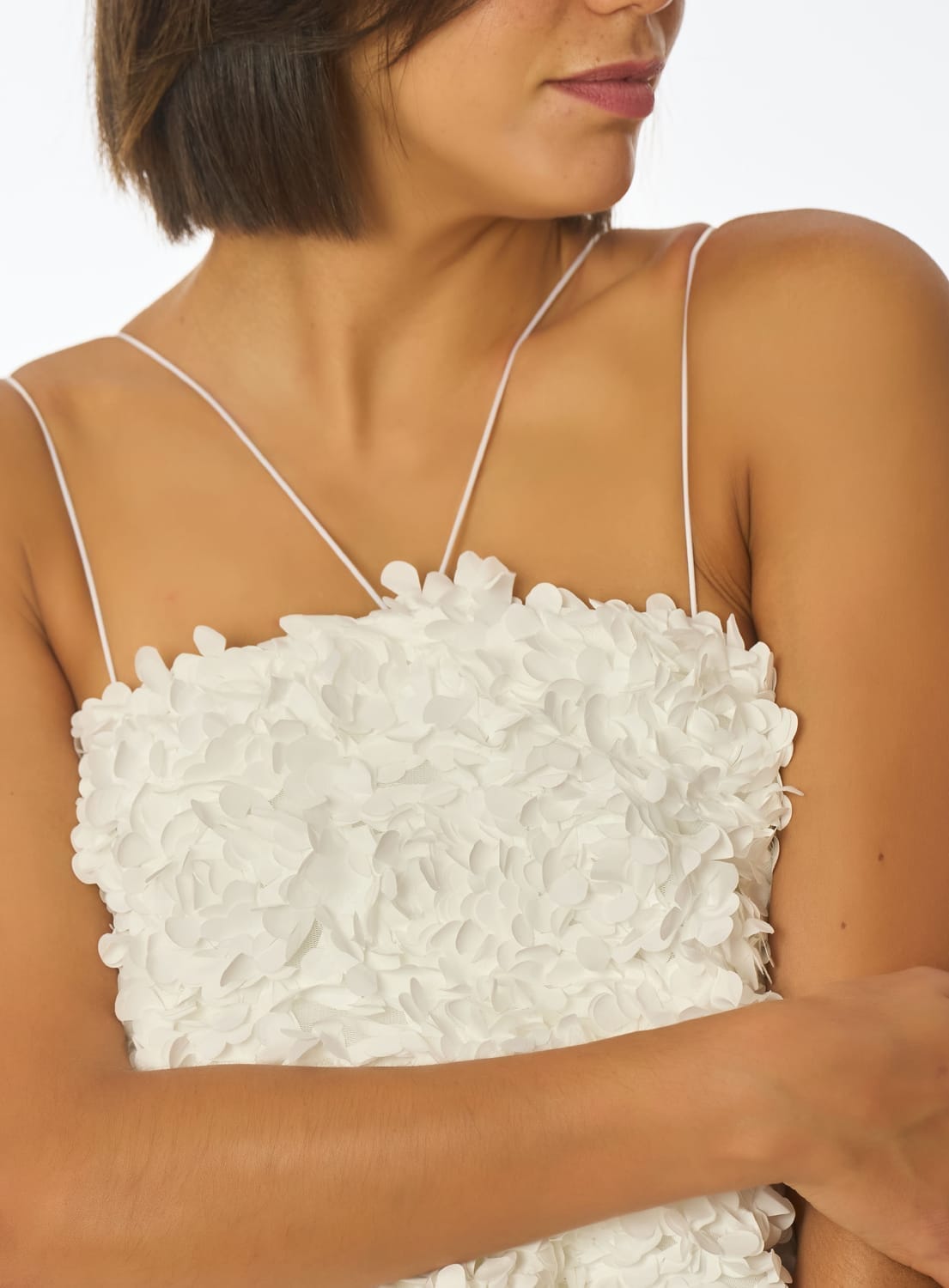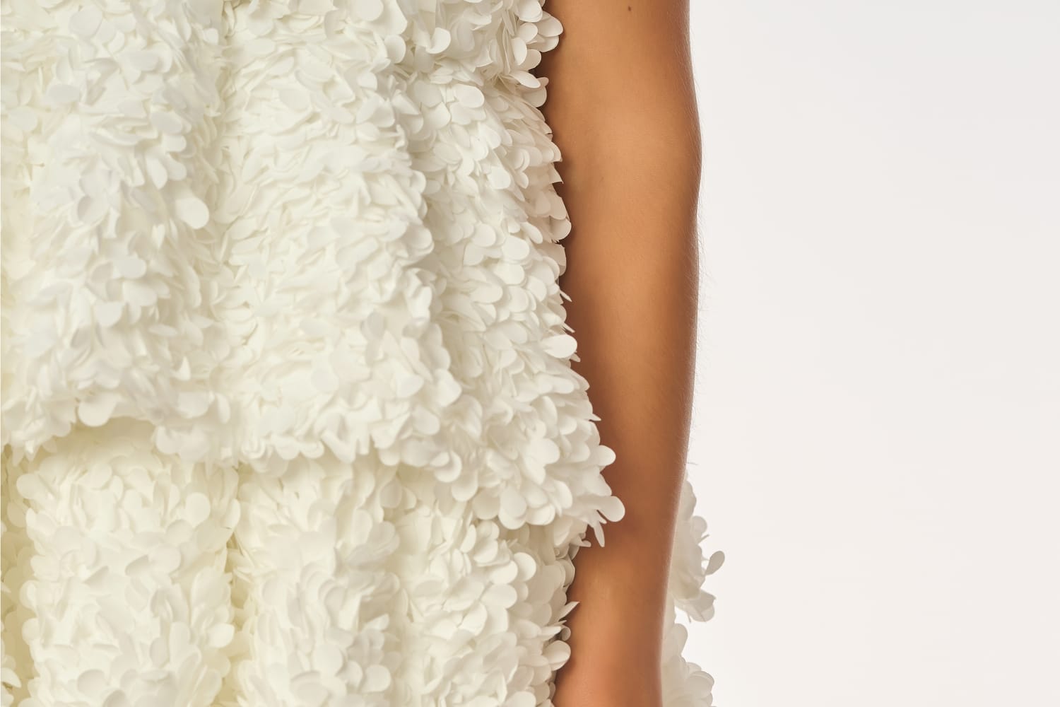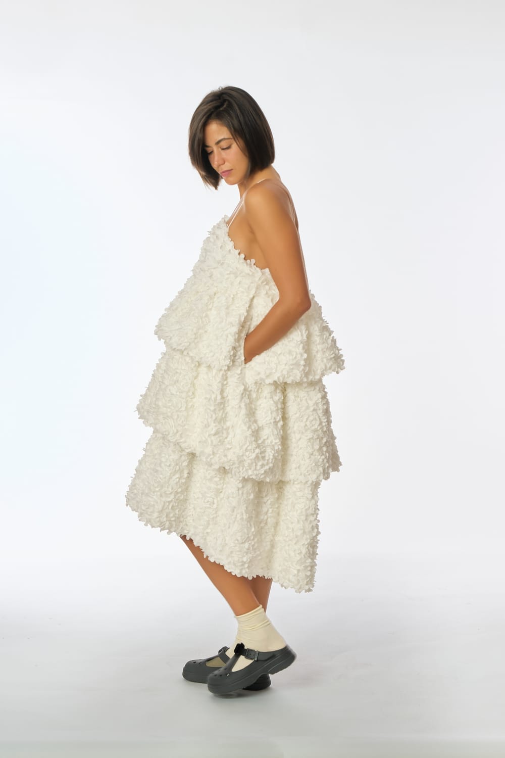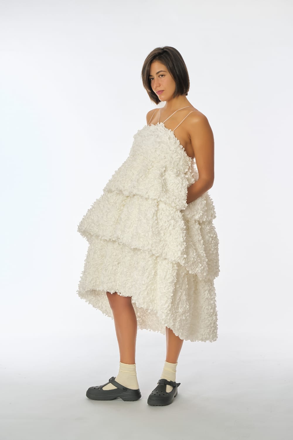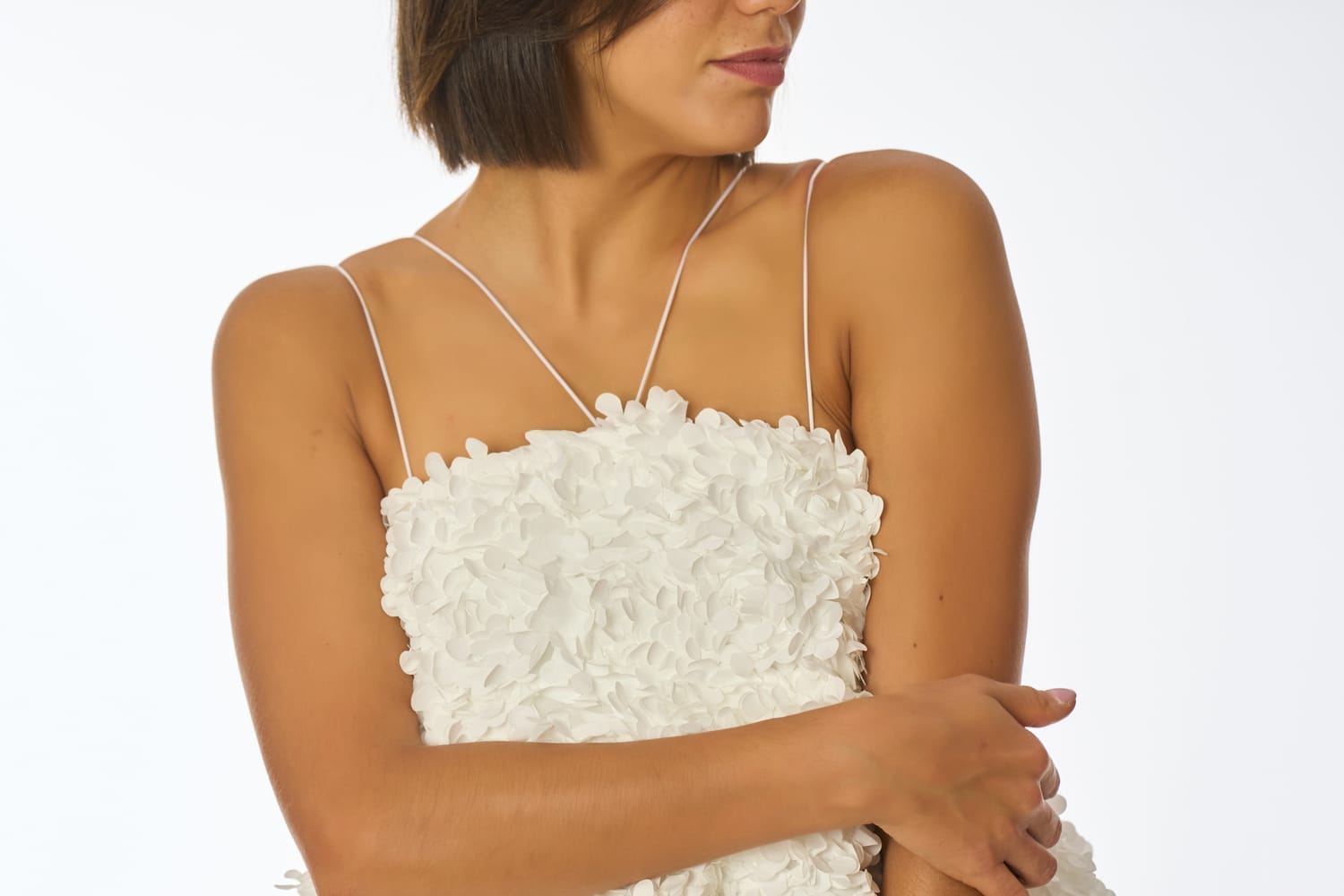 Exuberante y cautivador vestido midi confeccionado en tul bordado con pétalos en relieve. Una suave e imponente nube blanco roto formada por la superposición de amplios volantes, contrastada con su delicada espalda escotada con finos y sutiles tirantes cruzados.