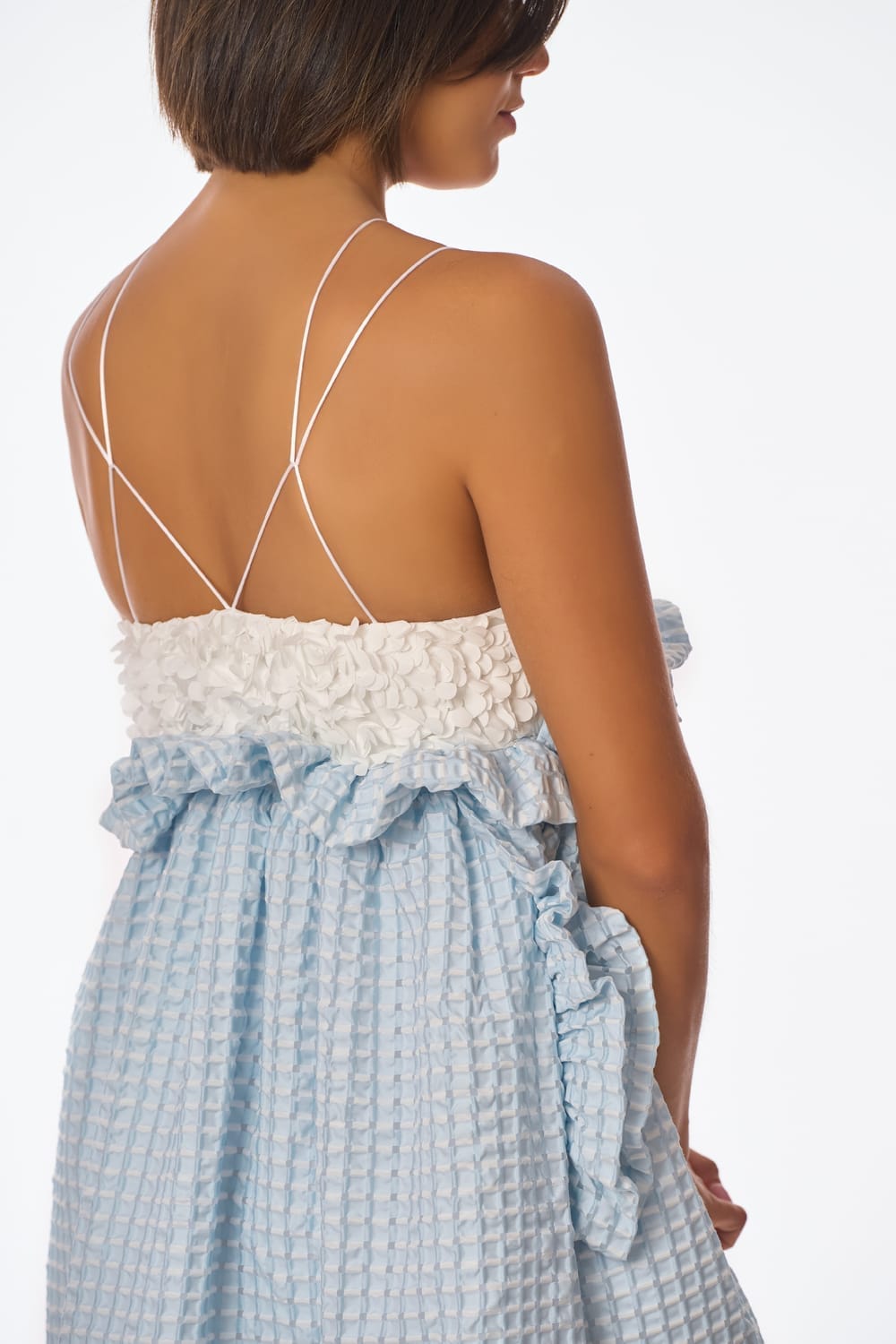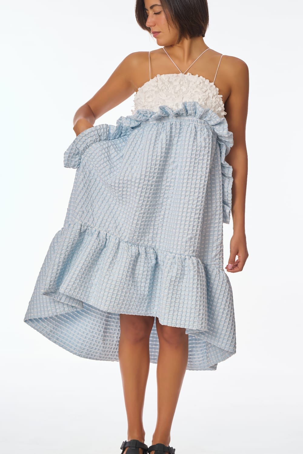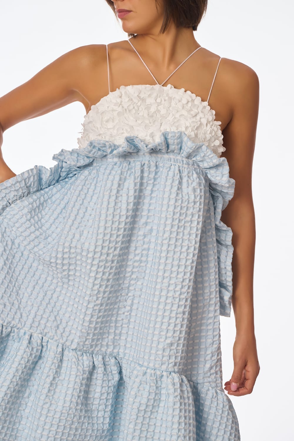 Suave top en tul bordado con pétalos en relieve blanco roto, de finos y delicados tirantes cruzados en su espalda, contrastado con una fresca y voluminosa falda midi en jacquard cloqué azul cielo, adornada con fruncidos y variados volantes.
