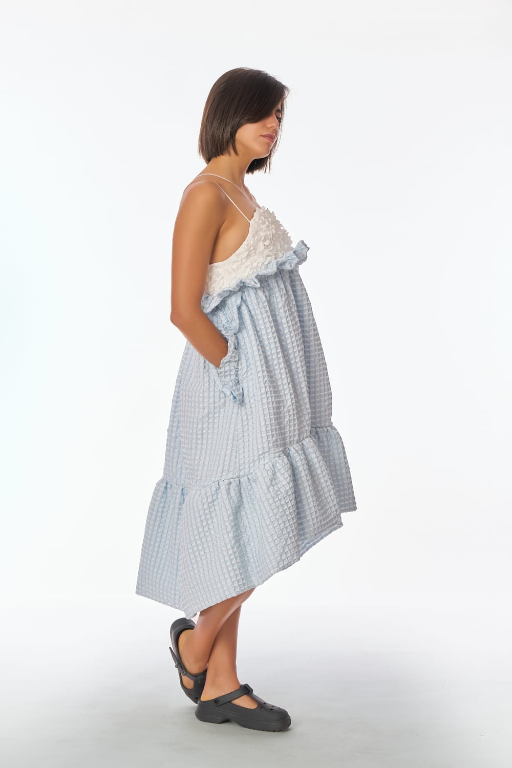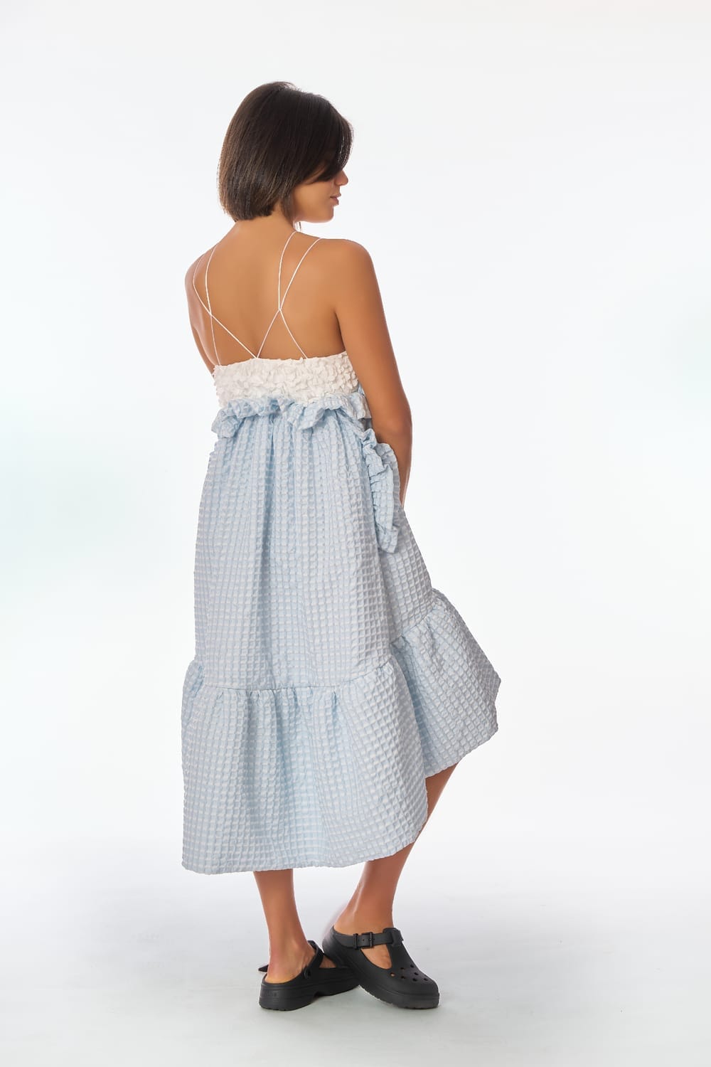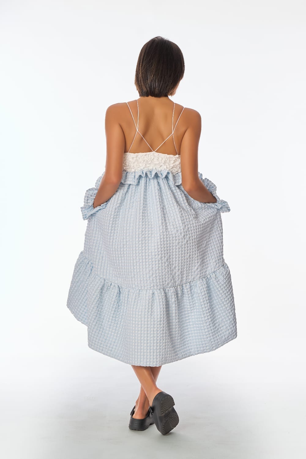 Suave top en tul bordado con pétalos en relieve blanco roto, de finos y delicados tirantes cruzados en su espalda, contrastado con una fresca y voluminosa falda midi en jacquard cloqué azul cielo, adornada con fruncidos y variados volantes.