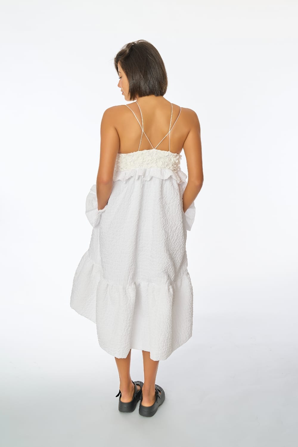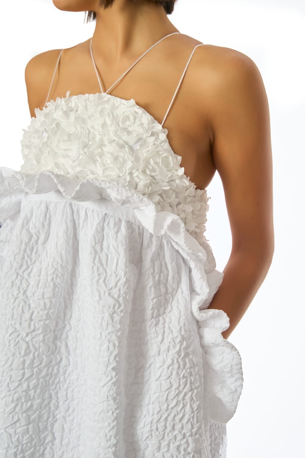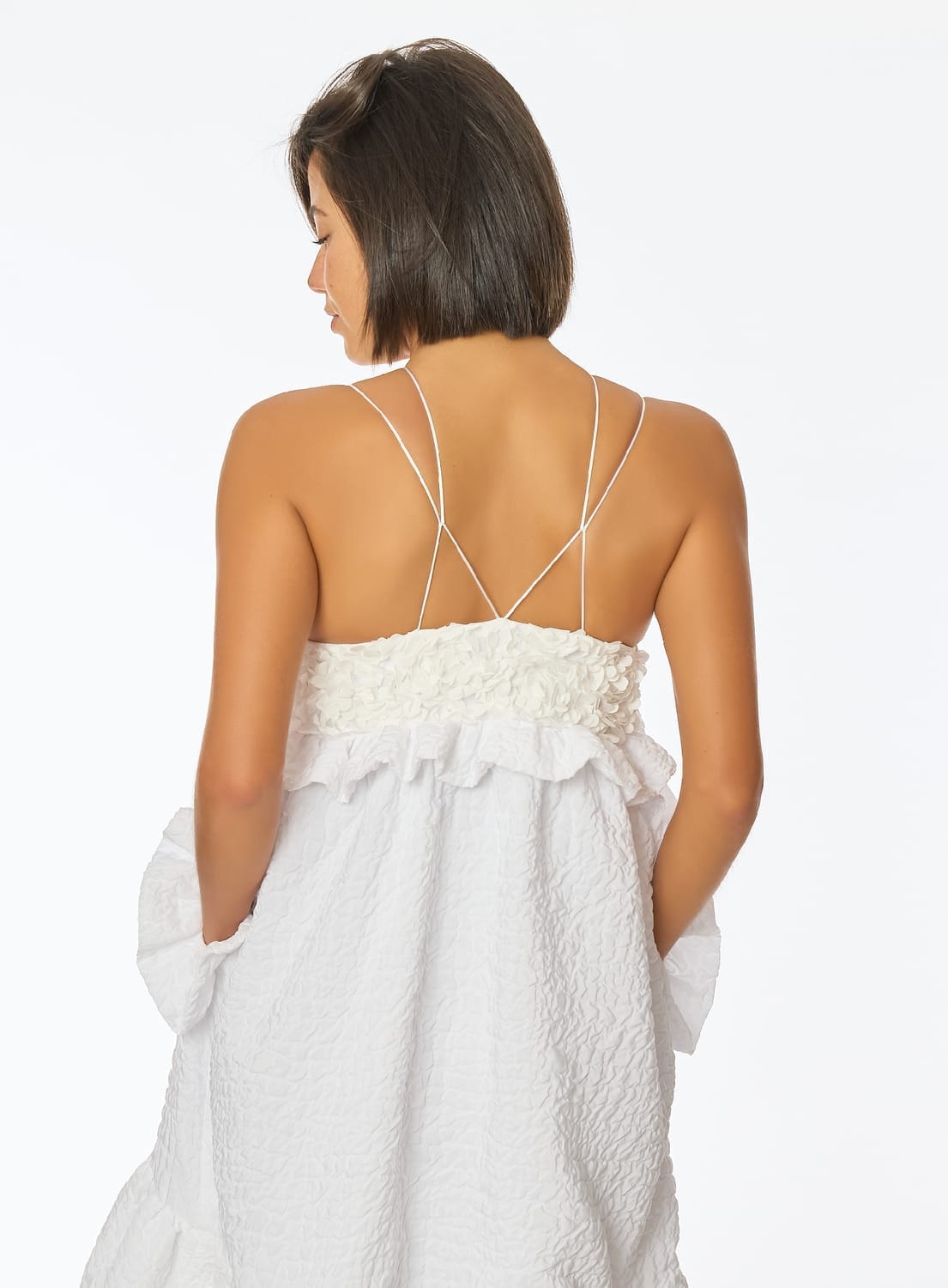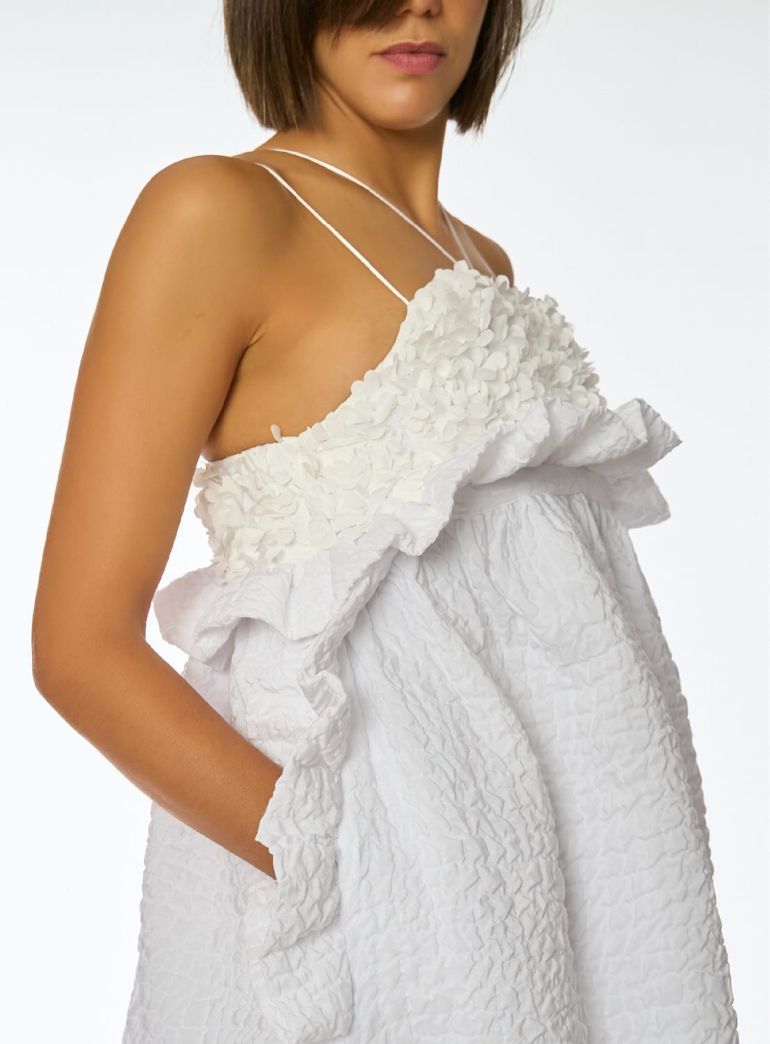 Suave top en tul bordado con pétalos en relieve, de finos y delicados tirantes cruzados en su espalda, contrastado con una fresca y voluminosa falda midi en jacquard cloqué blanco puro, adornada con fruncidos y variados volantes.