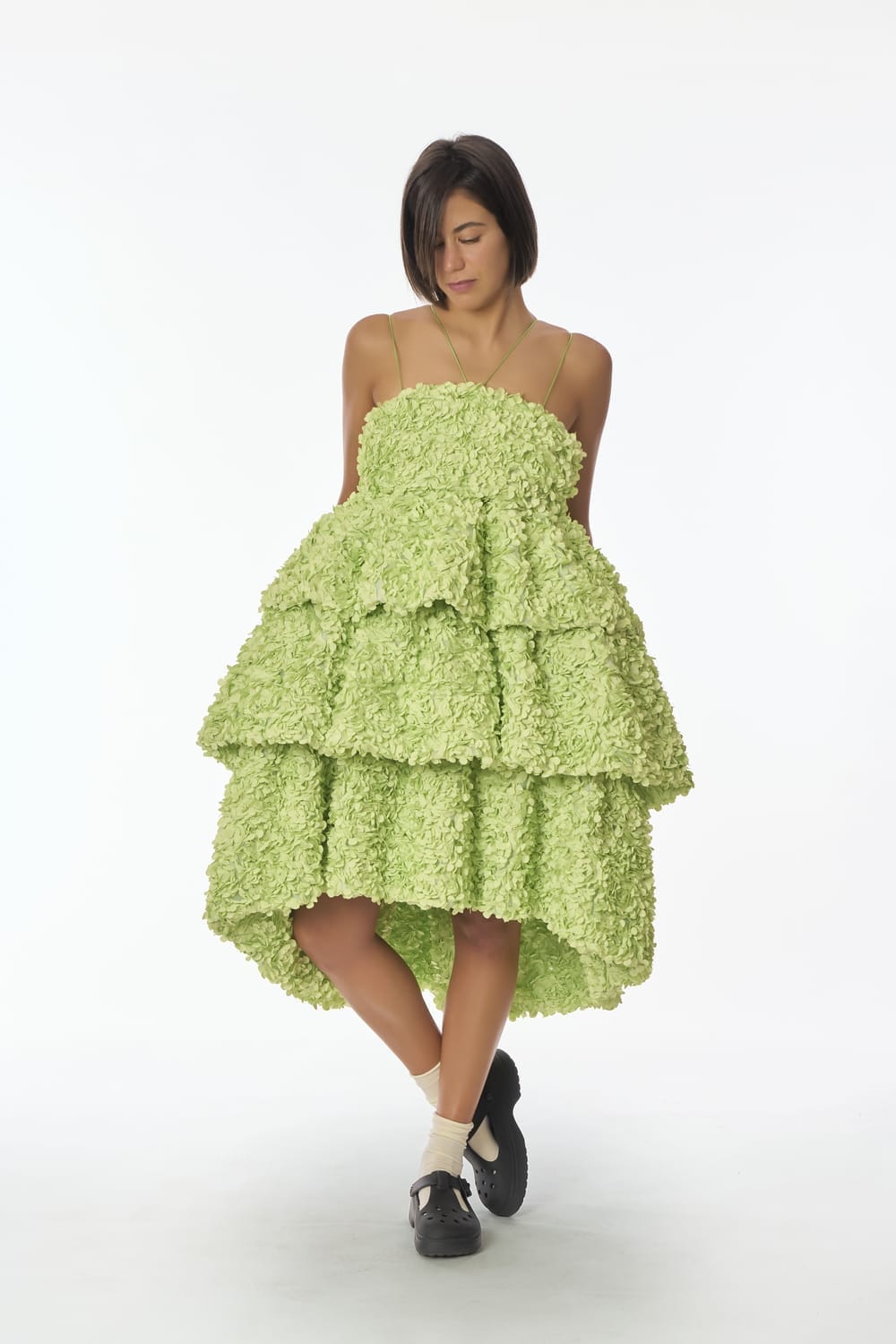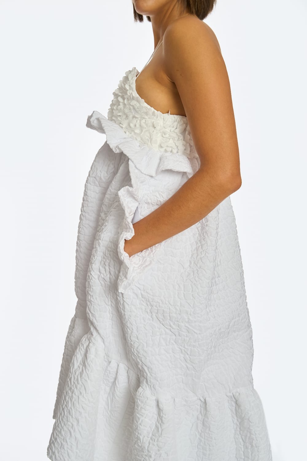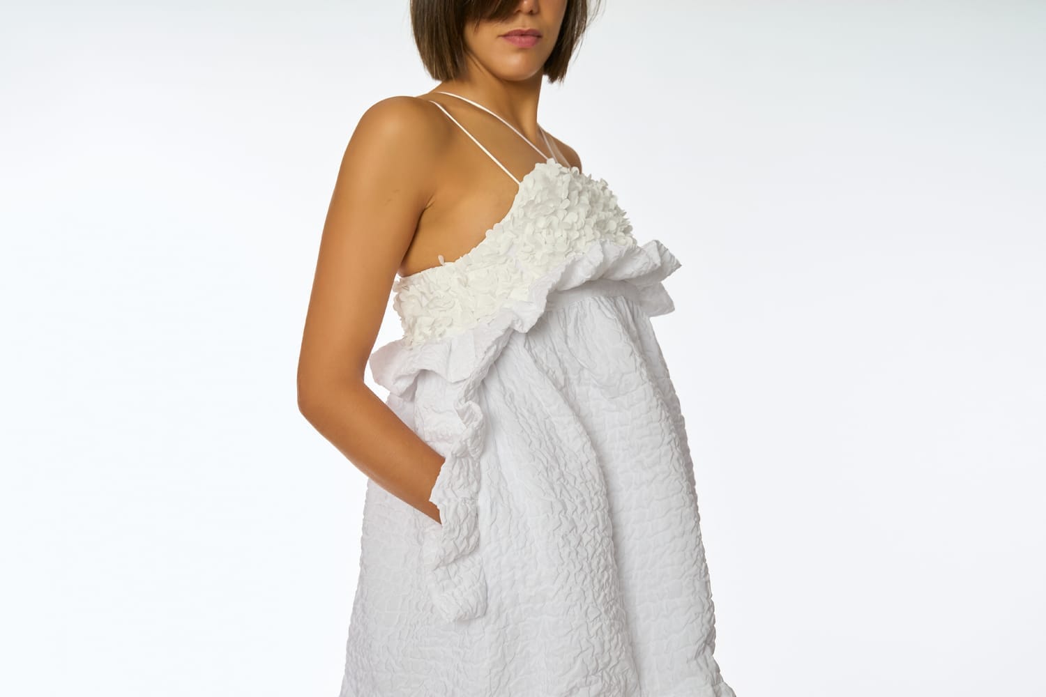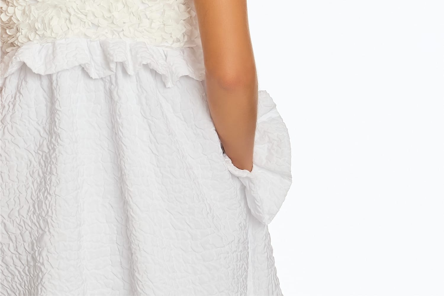 Suave top en tul bordado con pétalos en relieve, de finos y delicados tirantes cruzados en su espalda, contrastado con una fresca y voluminosa falda midi en jacquard cloqué blanco puro, adornada con fruncidos y variados volantes.